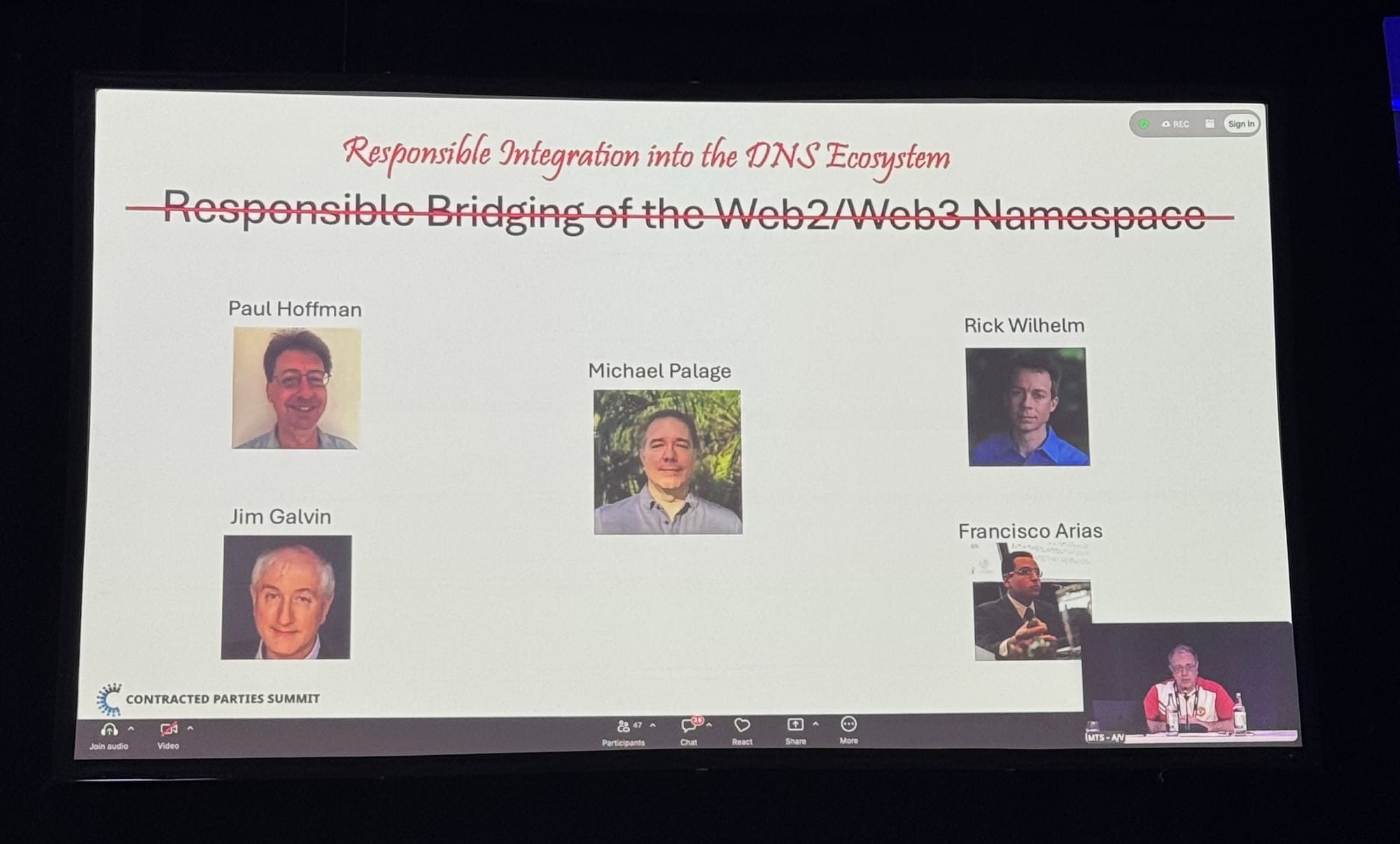 This announcement came during a panel entitled 'Responsible Bridging of the Web2/Web3 Namespace' that was selected through a democratic voting process from submitted proposals - that is to say, there is clearly interest from the ICANN community around alternate namespaces.
