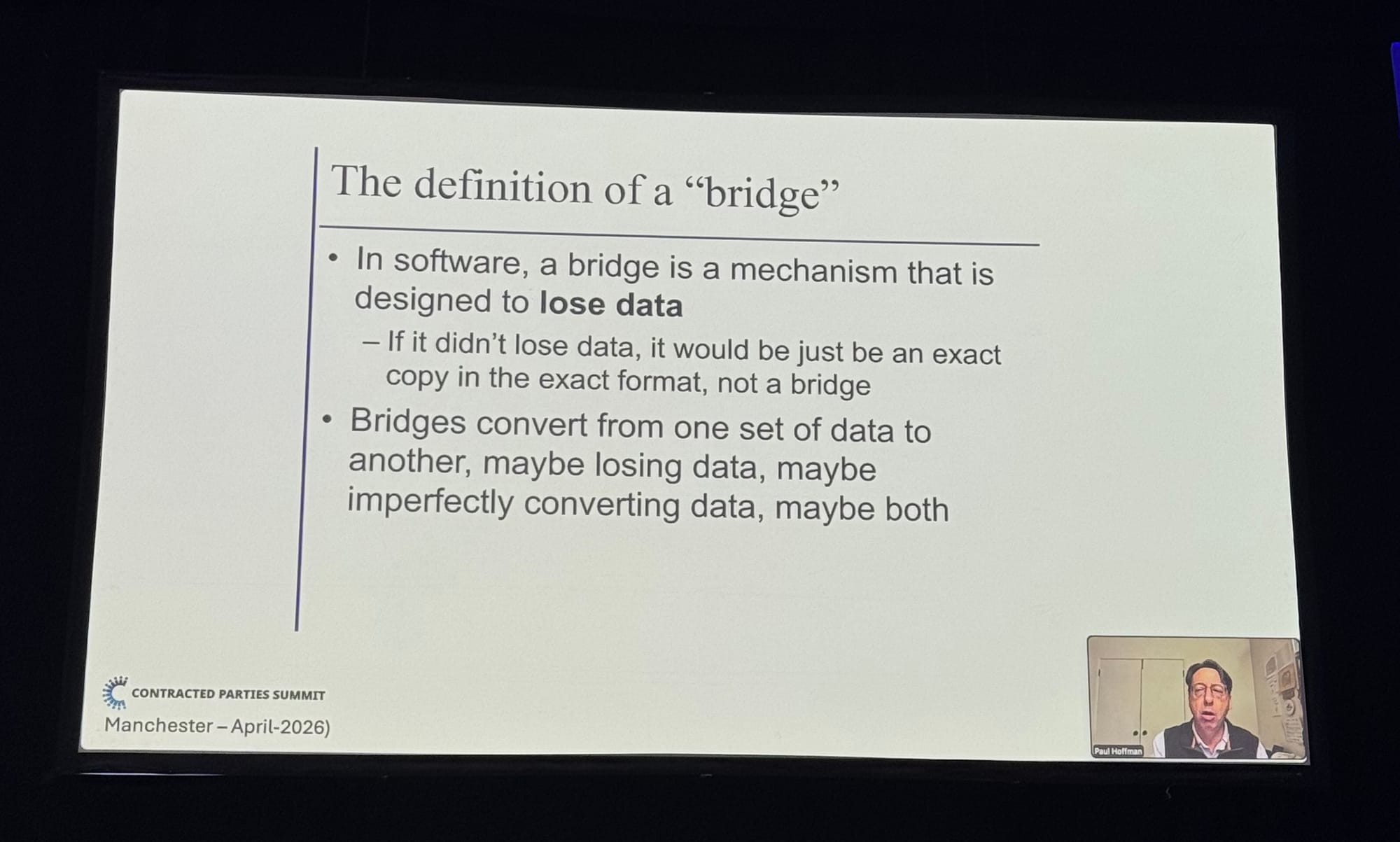 - Issues such as domain renewals, life cycle synchronization, data transformation, and attack vectors were flagged. I am a fan of Paul Hoffman's definition of a bridge, and note that it is an important albeit nuanced problem.